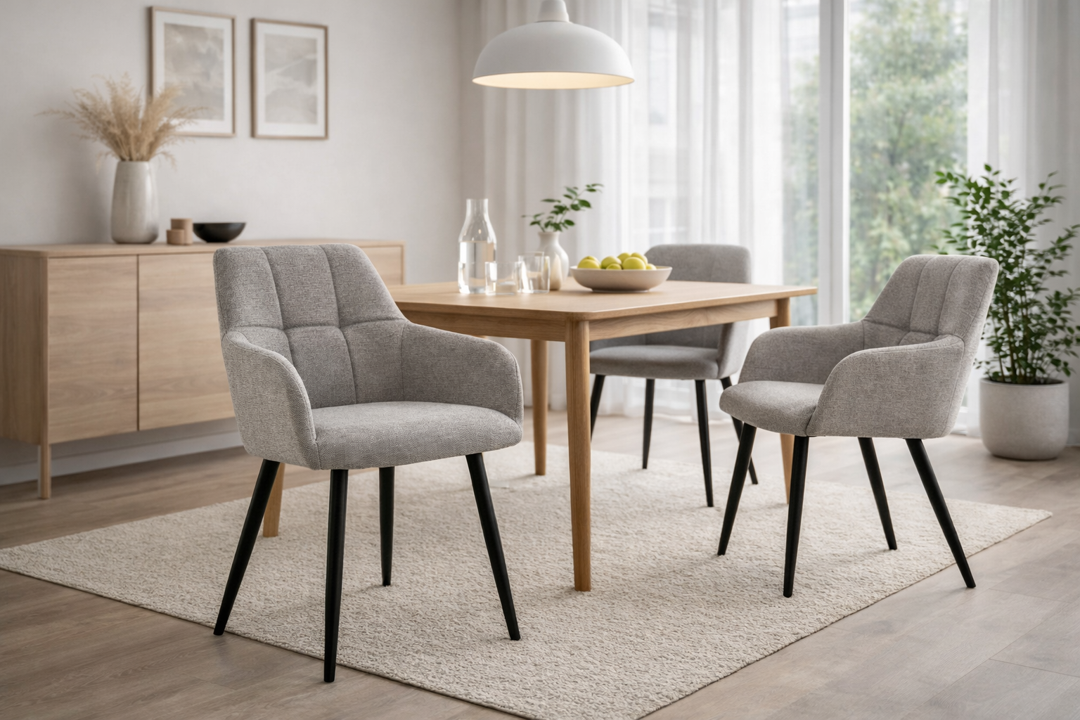 Krzesło NORDI to połączenie nowoczesnej formy, wygody i uniwersalnej kolorystyki. Jasnoszara tapicerka wprowadza do wnętrza ciepło i lekkość, a czarne metalowe nogi nadają całości wyrazistego, nowoczesnego charakteru. To model, który doskonale odnajdzie się zarówno w domowych aranżacjach, jak i we wnętrzach użytkowych.